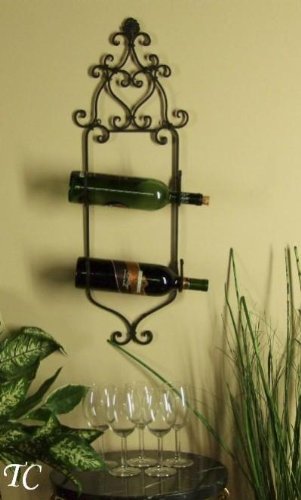 Old World Tuscan Wrought Iron Wall Towel Holder / Wine Rack This magnificent Tuscan wall rack is hand crafted of wrought iron with an antiqued mahogany, black/brown finish. Features an Old World scrolled iron design and accomodates 2 towels or wine bottles. Wrought iron decor adds charm and warmth to your Old-world Mediterranean home decor!Measures: 30" H X 10.25" W X 5.5" D